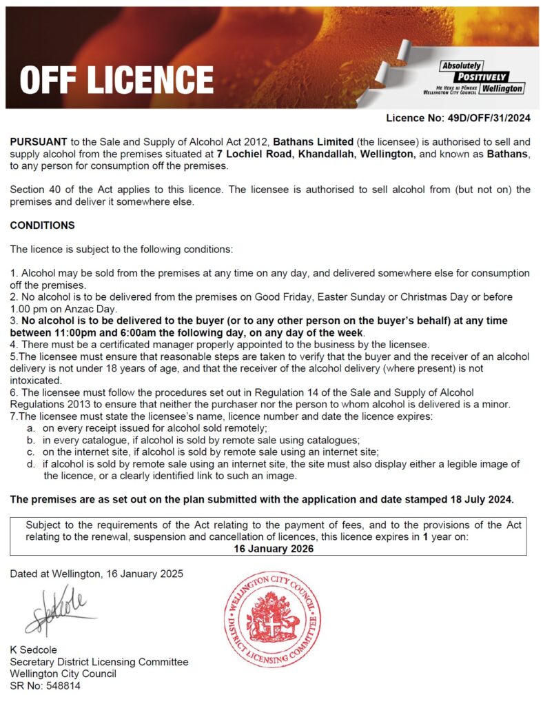 As per the Sale and Supply of Alcohol Act 2012, we do the following to meet our requirements relating to remote sales of alcohol: The licence holder’s name, licence number and licence expiry date are displayed here as well as on any receipt issued for a remote sale. A legible image of our licence is displayed on this internet site used to sell alcohol. We take reasonable steps to verify that the buyer and the receiver of any alcohol sold are 18 years old or over, by requiring anyone entering our site to tick an on screen box to confirm that they are over 18 years of age. The courier driver may ask the receiver to produce ID to verify their age.